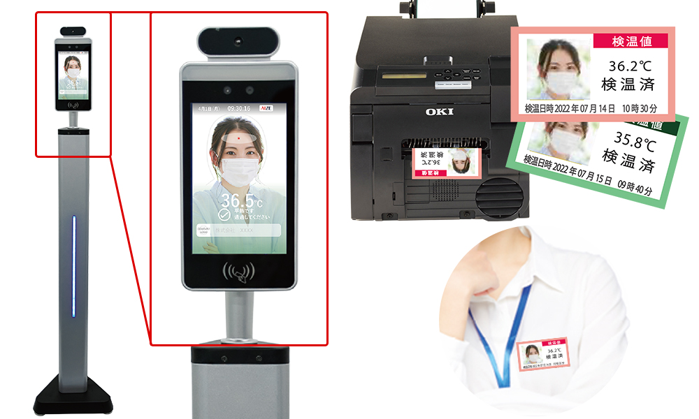 フルカラープリンタをセットした今までにない検温システムをご提案致します。顔をかざす事により、検温した結果を衣服用のラベルに印刷します。印刷されたラベルを衣類に貼る事で、健康状態を周知・可視化する事ができます。各事業所への来訪者様・接客業のスタッフの方・講習会・展示会等で一定時間滞在す方や、病院・デイケアーセンターにお見舞いに来られる方などへの様々な活用が有効です。フルカラー印刷(プリント)により、曜日毎に色を変える等、デザインの変更も可能です。