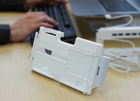 実際購入されたお客様から問い合わせはありますか?という質問に、松山様、栗原様は「マクセルのリーダ・ライタにつきまして、導入準備や操作説明に関しては大きなトラブルは今までありません。他社のリーダ・ライタと違い、ドライバのインストールが不要でUSBケーブルを差し込むだけでお使いいただけること、説明も電子車検証の形状に専用設計されたスタンドがありますので、スタンドに電子車検証を入れていただくだけです。私たちがお客様のサポートをしていく上では、シンプルでとても説明がしやすいです。」