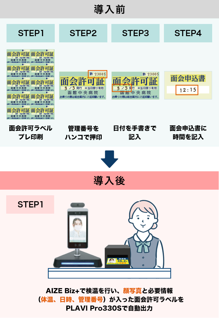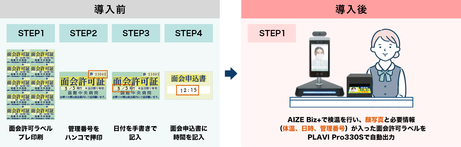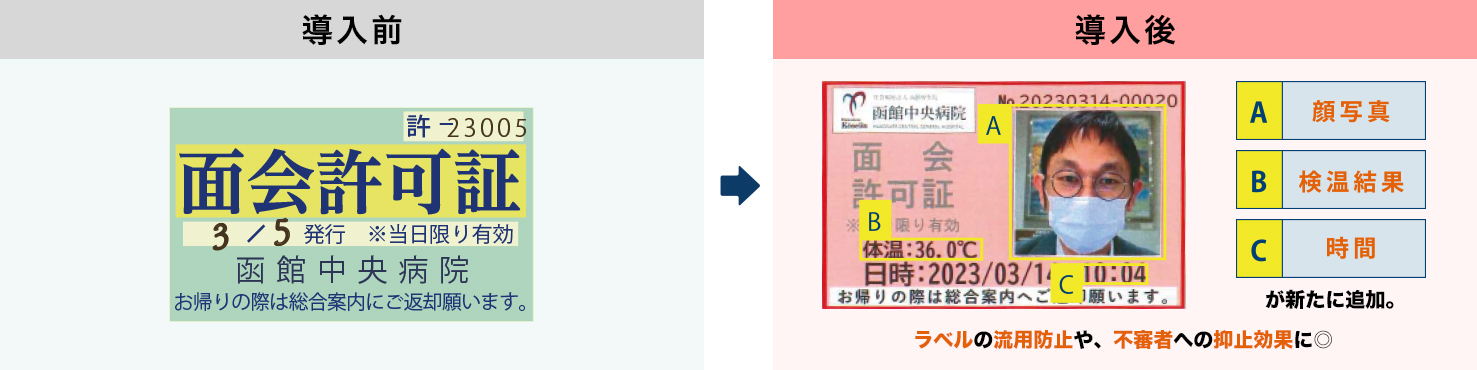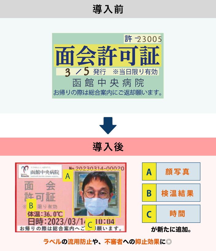 ラベルが剥がれたり落ちたりすることが無くなり面会許可を受けたことが誰でも分かるようになりました。また、顔写真がある事で本人の受付である事が一目瞭然に。時間も入る事で、長期滞在者に気が付くポイントが増え防犯上嬉しい点です。